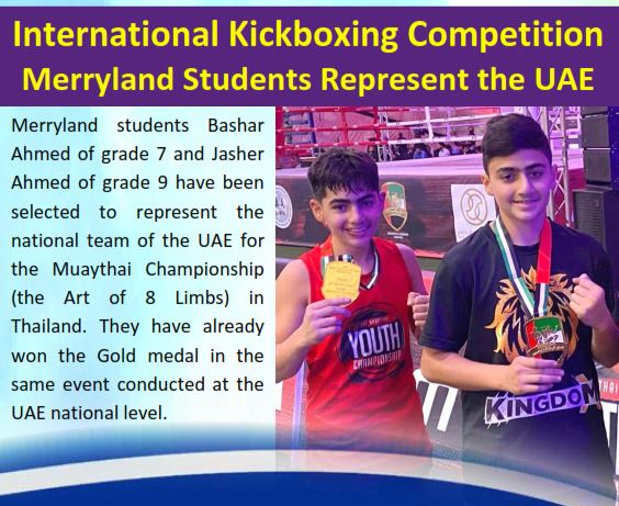 Merryland students Bashar Ahmed of grade 7 and Jasher Ahmed of grade 9 have been selected to represent the national team of the UAE for the Muaythai Championship (the Art of 8 Limbs) in