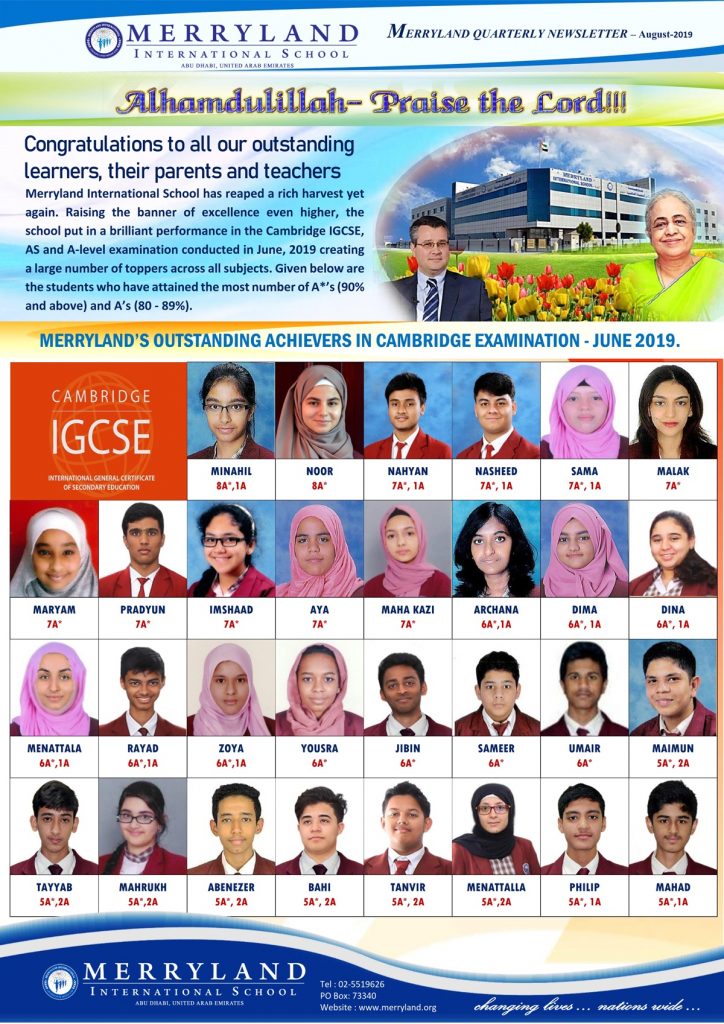Merryland International School has reaped a rich harvest yet again. Raising the banner of excellence even higher, the school put in a brilliant performance in the Cambridge IGCSE,AS and A-level examination conducted in June, 2019 creating a large number of toppers across all subjects. Given below are the students who have attained the most number of A*’s (90% and above) and A’s (80 – 89%).