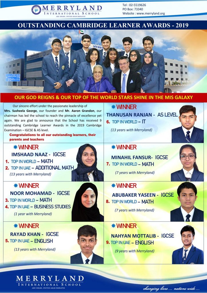 chairman has led the school to reach the pinnacle of excellence yet again. We are glad to announce that the School has received 9 outstanding Cambridge Learner Awards in the 2019 Cambridge Examination – IGCSE & AS level.