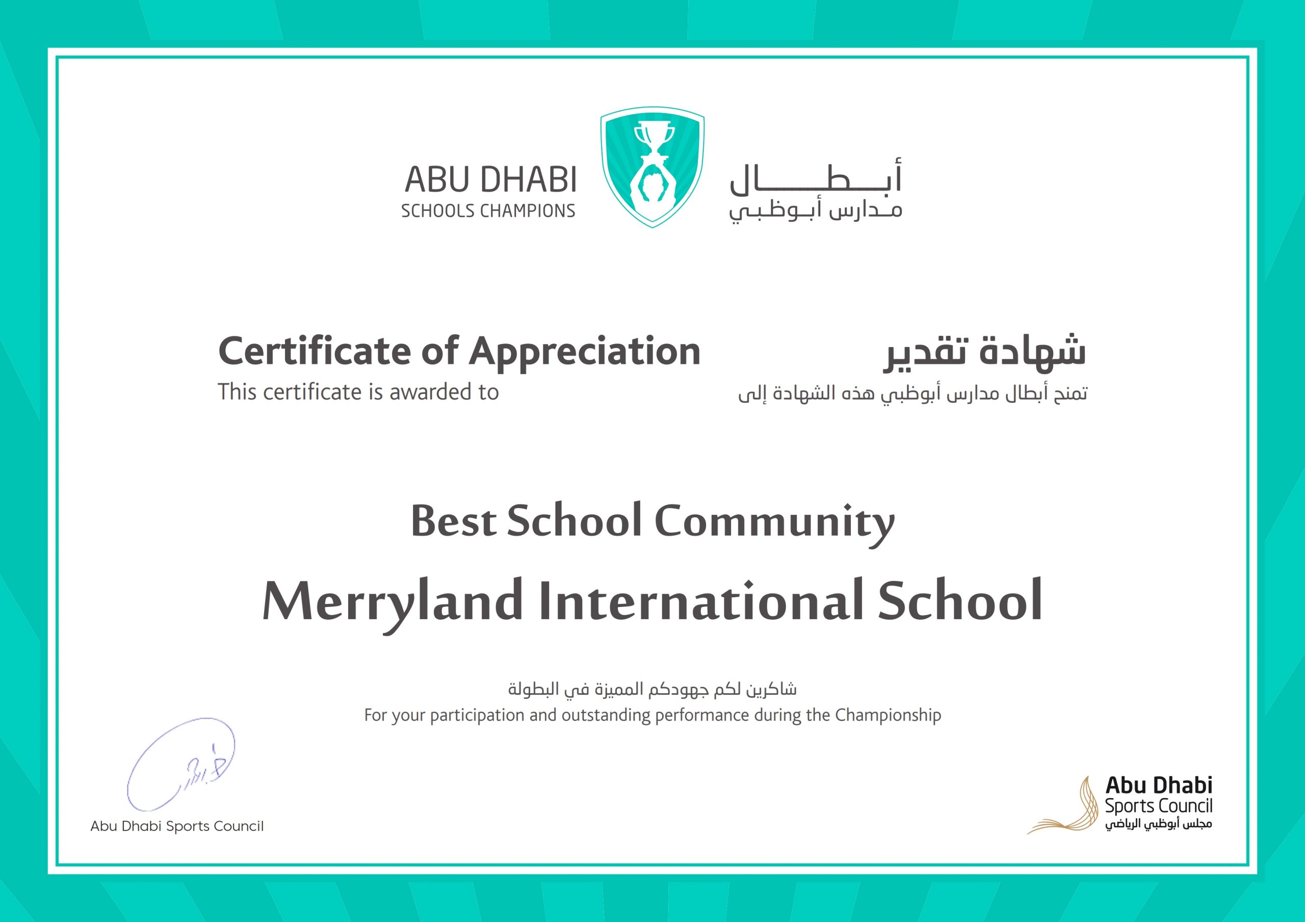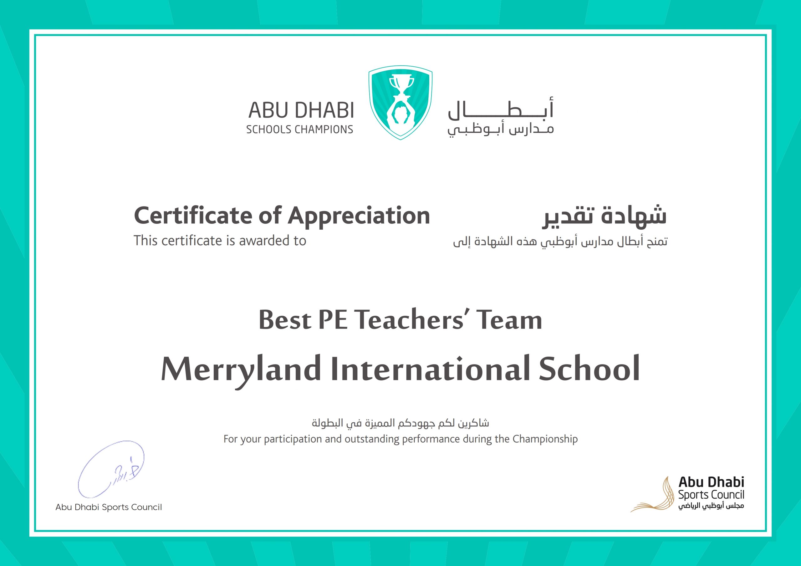 Abu Dhabi Sports Council also awarded Merryland as the “Best School Community ” and our PE Teachers’ Team has been awarded as the BEST.
